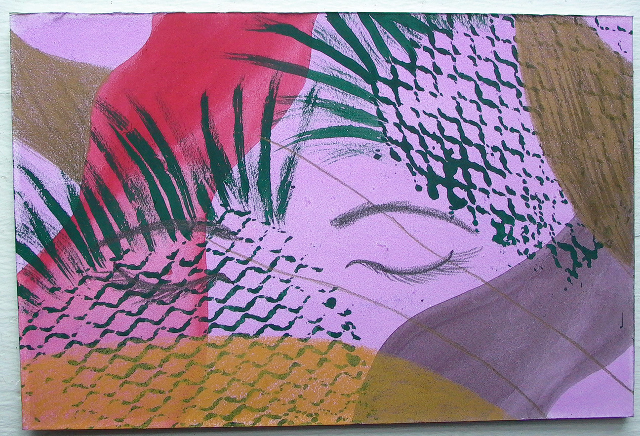 I painted and drew the artwork picture above for the A.I.R. gallery’s benefit show Wish You Were Here 10. Many artists, both well-known (for example, Yoko Ono) and lesser-known (for example, me) contributed 4″ x” 6″ original art. I was there tonight for the main opening of the postcard show and it was a lot of fun to see all of the different styles and materials that the contributors worked with.